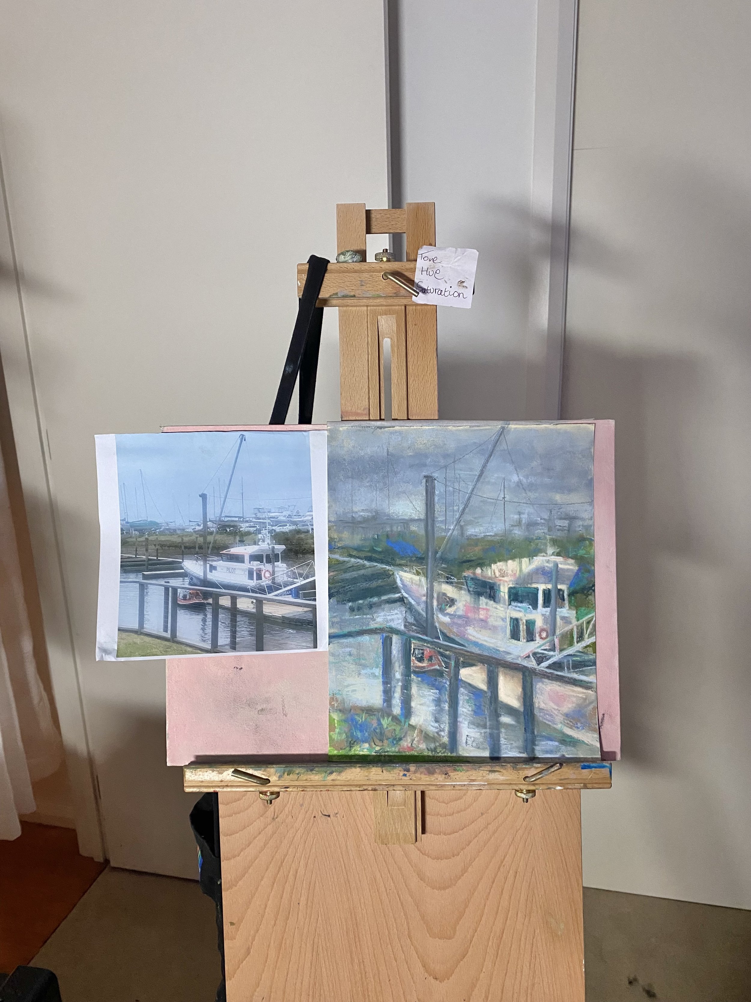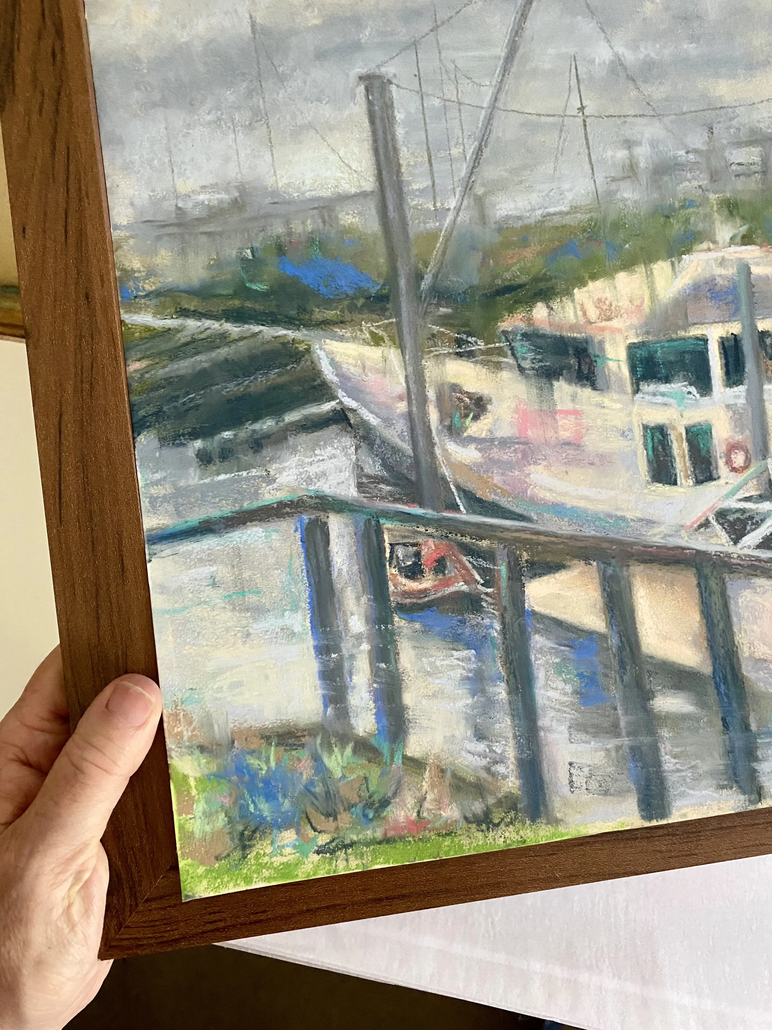 Keywords: Yaringa Boat Harbour painting, Mornington Peninsula artist, Australian harbour art, soft pastel boat painting.